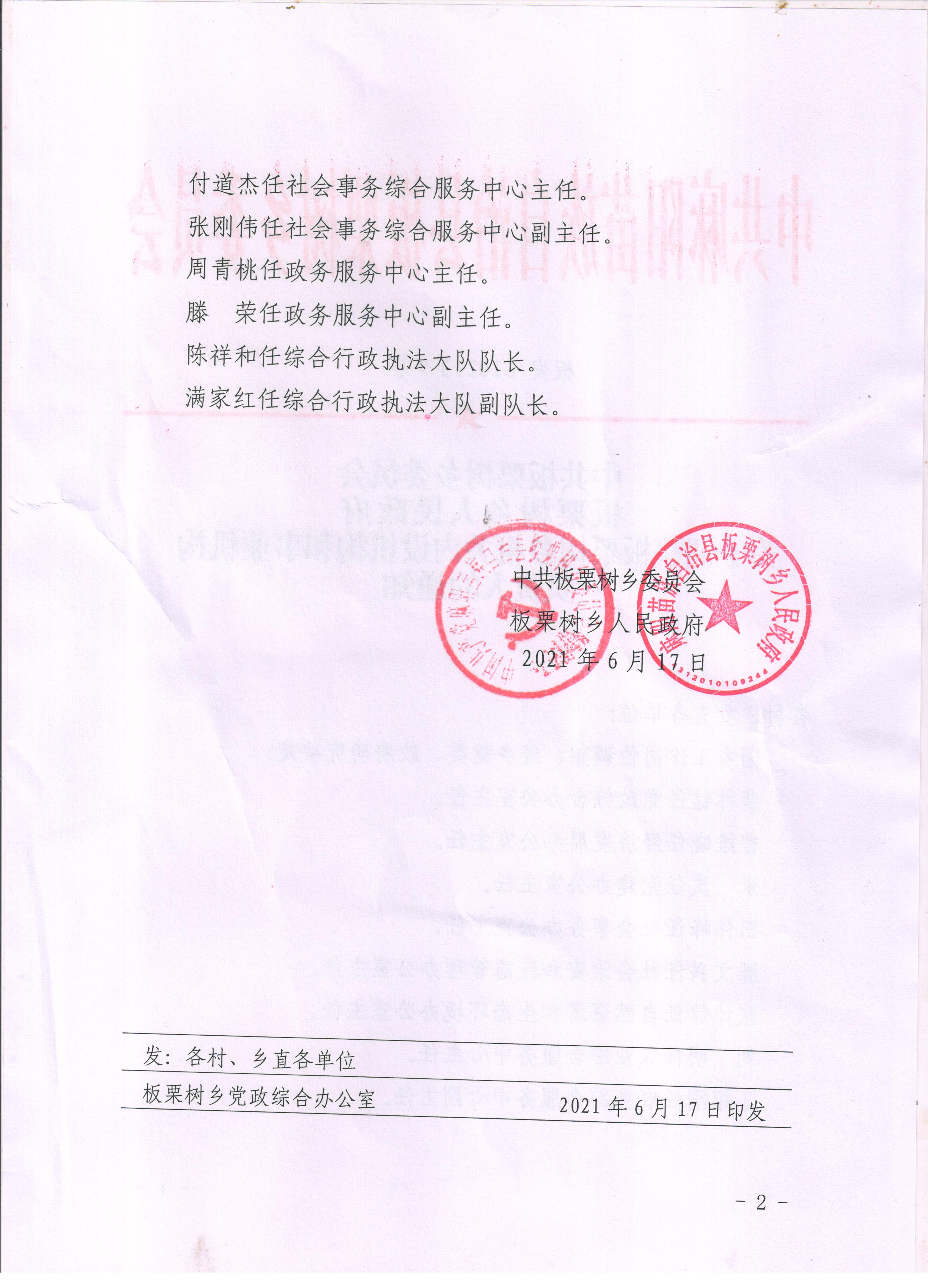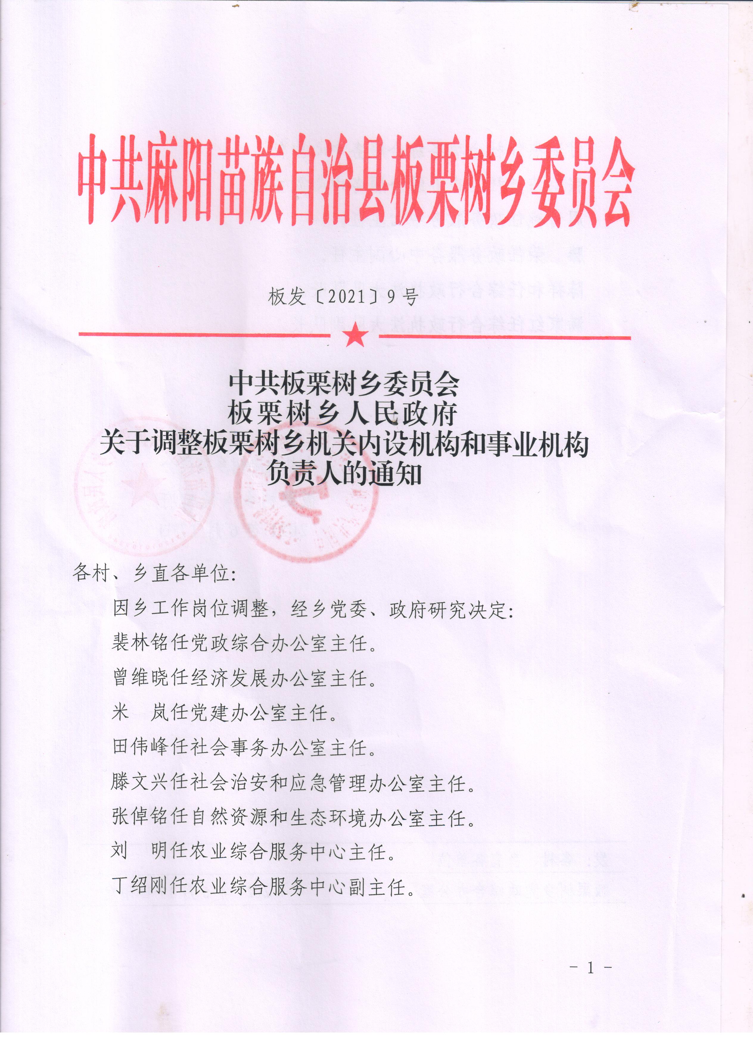 關於調整板栗樹鄉機關事業單位負責人調整通知 麻陽苗族自治縣人民政府 https://www.zwgsc.com 發布時間: 2021-06-30 12:12 【字體:大 小】 分享到 來源:麻陽縣板栗樹鄉 作者:周信管