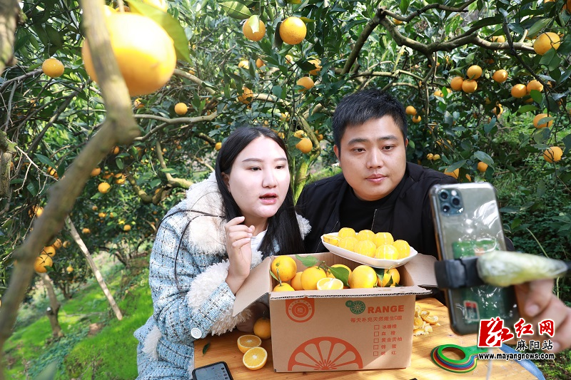 11月30日中午時分,在江口墟鎮顏家坪自然村山坡上的一處果園內,陳林與妻子文芬支起一張桌子,架起一部手機,與綠油油的果樹、黃澄澄的冰糖橙、碧波蕩漾的江水同框。