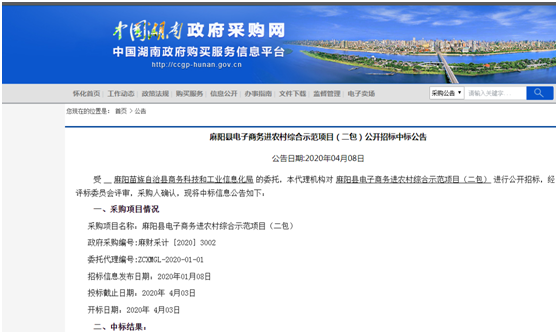 麻陽縣電子商務進農村綜合示範項目(二包)公開招標中標公告 麻陽苗族自治縣人民政府 https://www.zwgsc.com 發布時間: 2020-04-09 15:05 【字體:大 小】 麻陽縣電子商務進農村綜合示範項目(二包)公開招標中標公告 分享到 來源:麻陽縣商務科技和工業信息化局 作者: