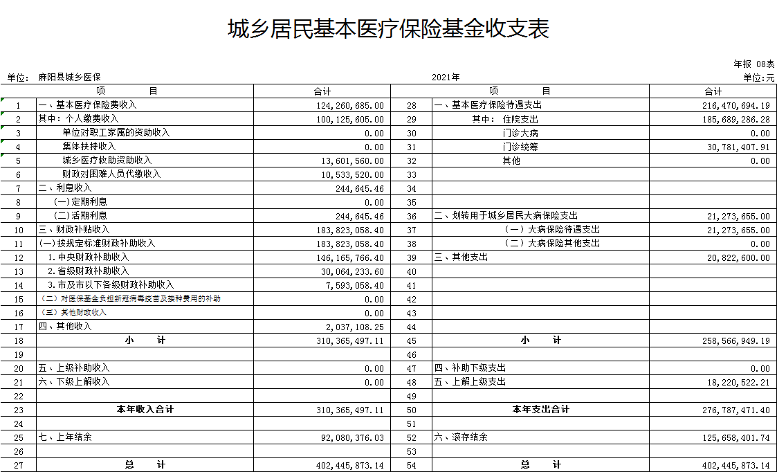 2021年城鄉居民基本醫療保險基金收支情況 麻陽苗族自治縣人民政府 https://www.zwgsc.com 發布時間: 2022-05-31 15:11 【字體:大 小】 分享到 來源:麻陽縣醫療保障局 作者: