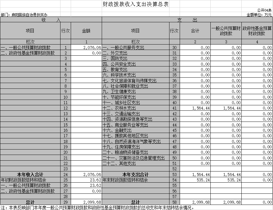 2019年度財政撥款總收入2076.06萬元,與2018年相比,增加1420.21萬元,增長68.41%,主要是因為扶貧特惠保、扶貧駐村及扶貧幫扶責任人、扶貧小額信貸借款人等保險費和其他交通費收入的增加。