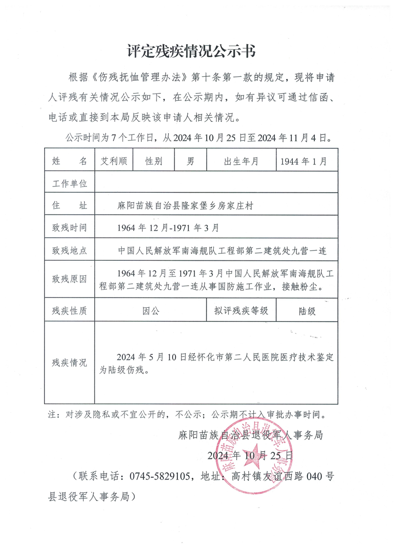 評定殘疾情況公示書(艾利順)