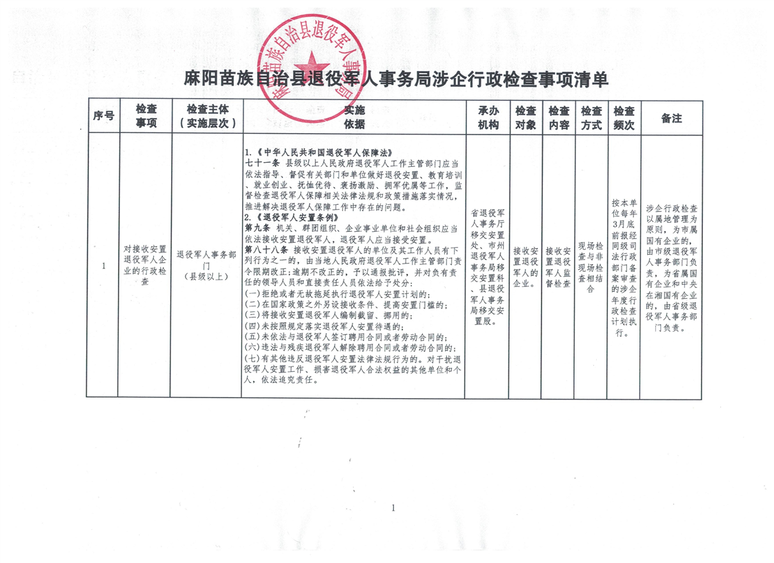 麻陽苗族自治縣退役軍人事務局涉企行政檢查事項清單 麻陽苗族自治縣人民政府 https://www.zwgsc.com 發布時間: 2025-04-28 14:59 【字體:大 小】 分享到 來源:麻陽苗族自治縣退役軍人事務局 作者: