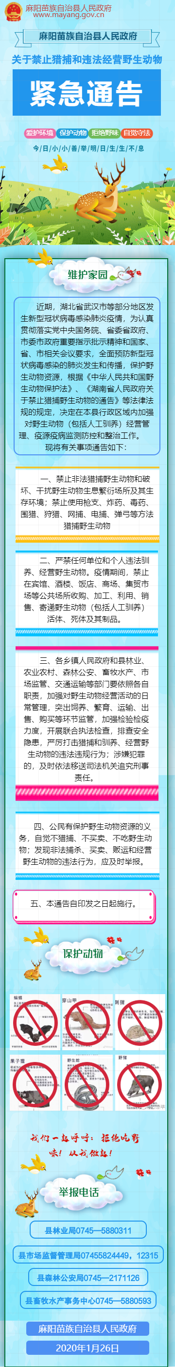 圖解:麻陽苗族自治縣人民政府關於禁止獵捕和違法經營野生動物的緊急通告 麻陽苗族自治縣人民政府 https://www.zwgsc.com 發布時間: 2020-02-03 14:55 【字體:大 小】 相關閱讀 關於《麻陽苗族自治縣人民政府關於禁止獵捕和違法經營野生動物的緊急通告》的解讀 麻陽苗族自治縣人民政府關於禁止獵捕和違法經營野生動物的緊急通告 分享到 來源:麻陽縣政務服務中心 作者: