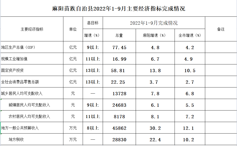 麻陽苗族自治縣2022年1-9月主要經濟指標完成情況