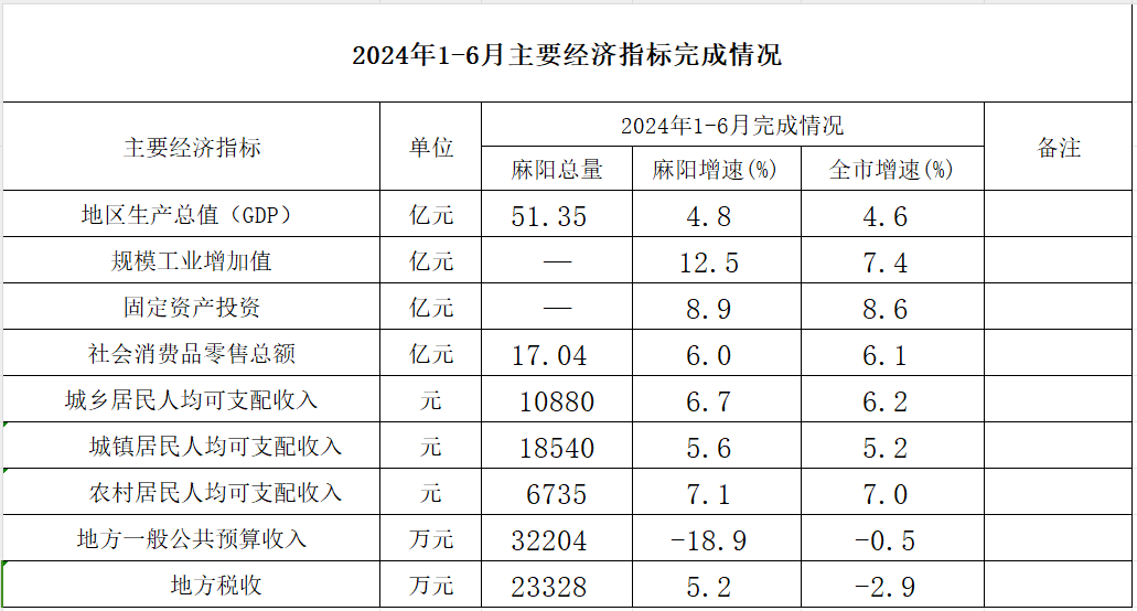 麻陽苗族自治縣2024年1-6月主要經濟指標完成情況
