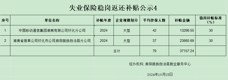失業保險穩崗返還補貼公示4 麻陽苗族自治縣人民政府 https://www.zwgsc.com 發布時間: 2024-10-15 09:23 【字體:大 小】 分享到 來源:麻陽縣人力資源和社會保障局 作者: