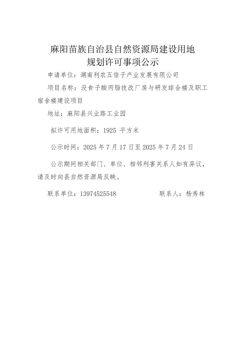 建設用地規劃許可事項公示(沒食子酸丙脂技改廠房與研發綜合樓及職工宿舍樓建設項目)