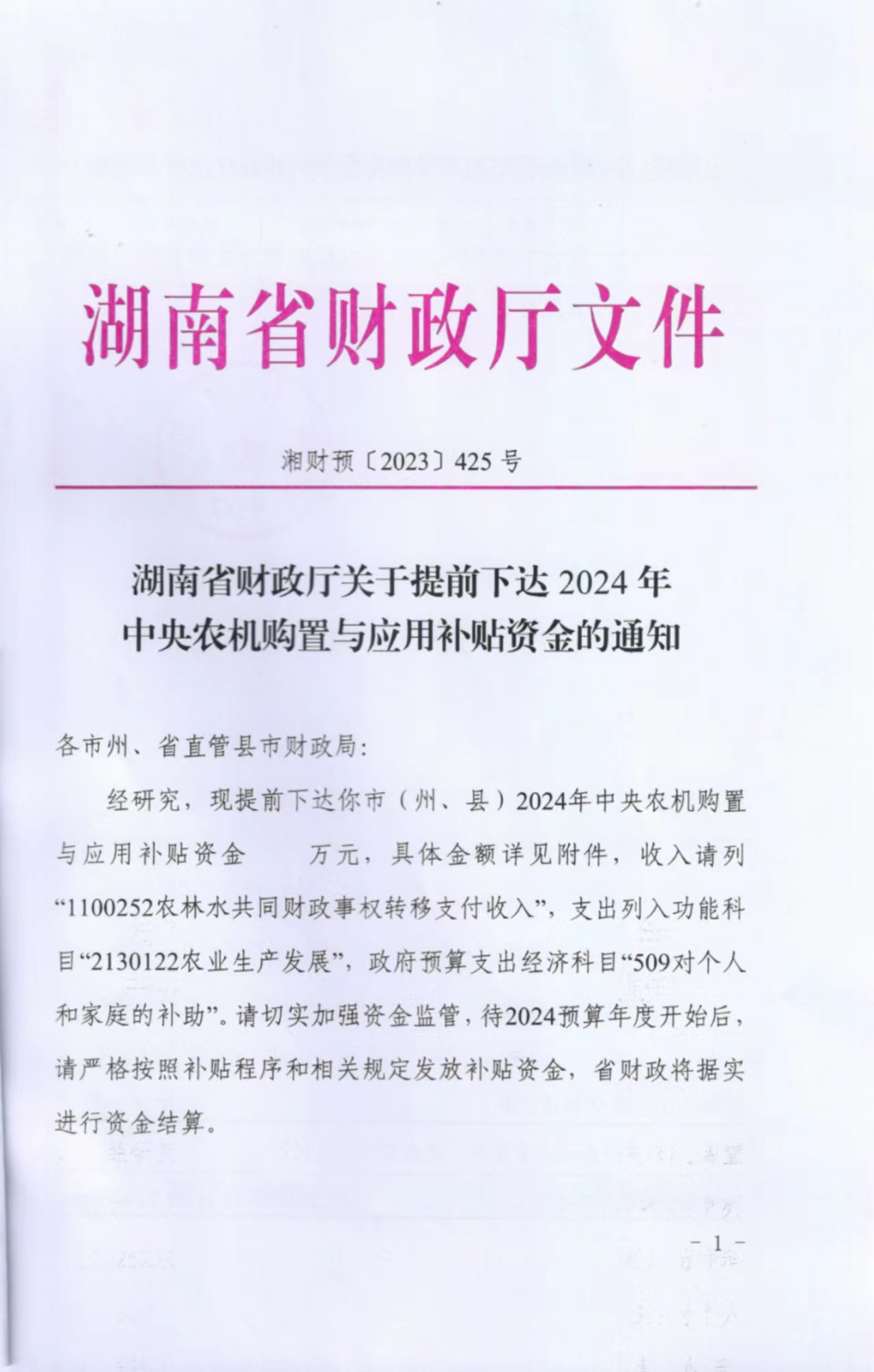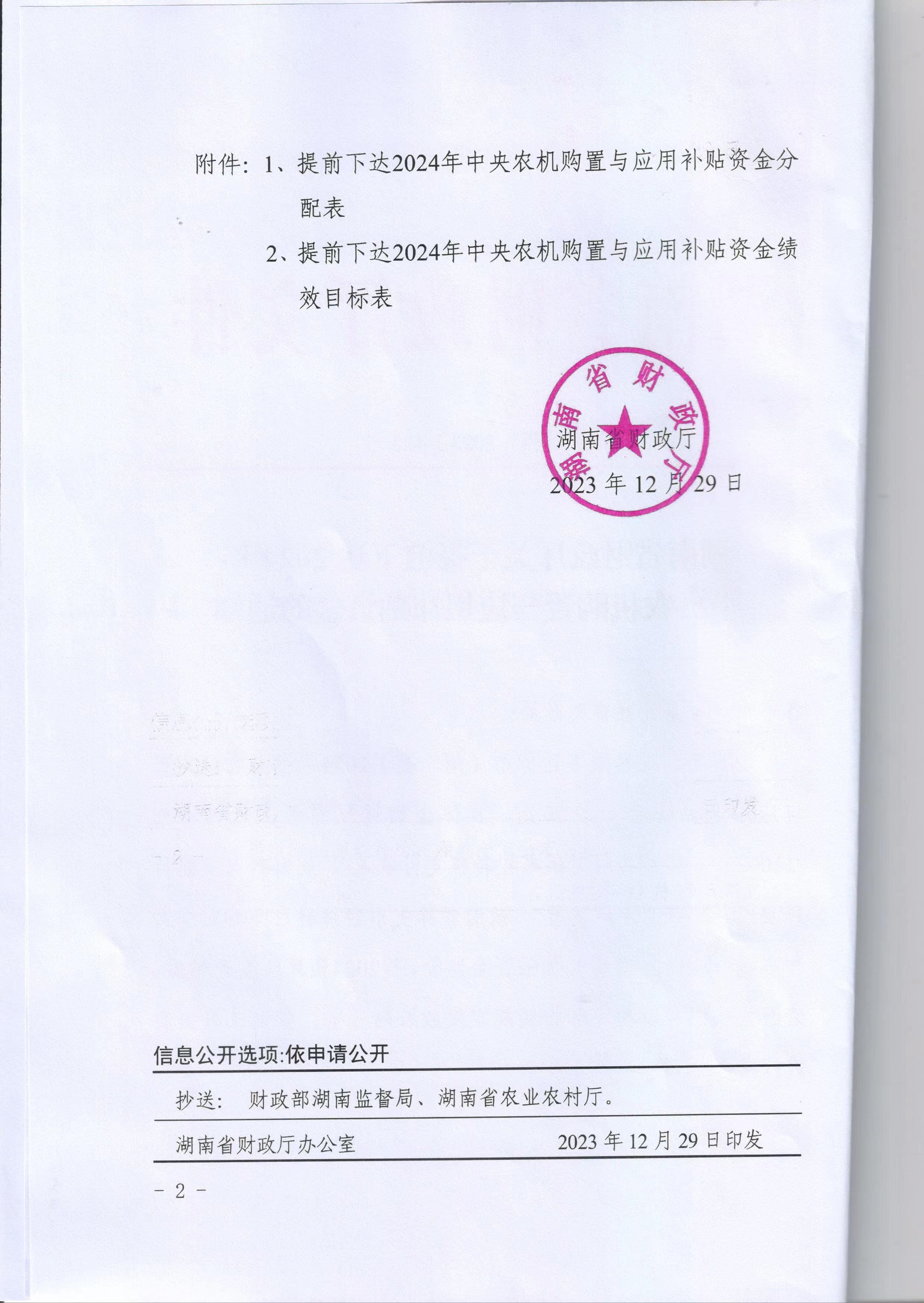 湖南省財政廳關於提前下達2024年中央農機購置與應用補貼資金的通知