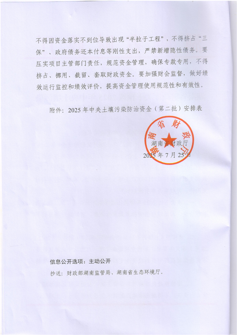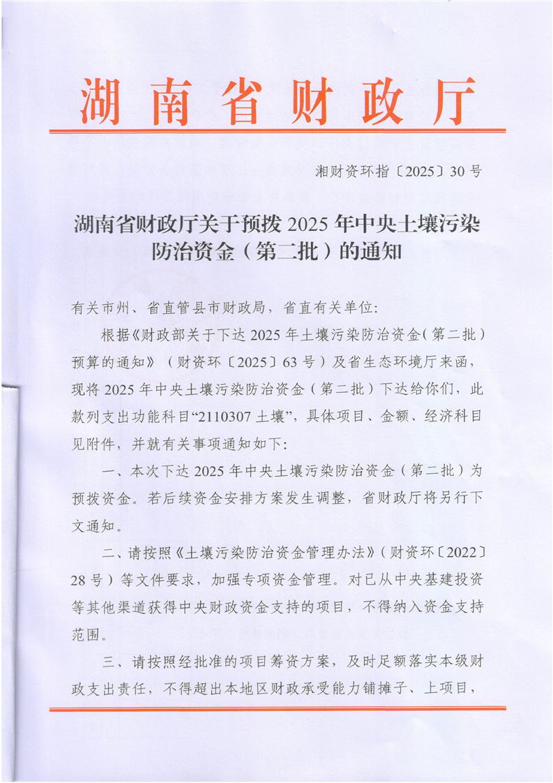 湖南省財政廳關於預撥2025年中央土壤汙染防治資金(第二批)的通知
