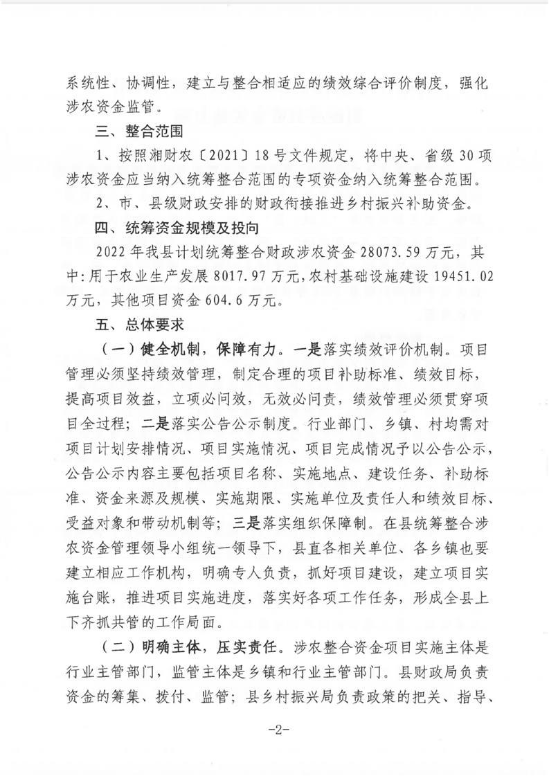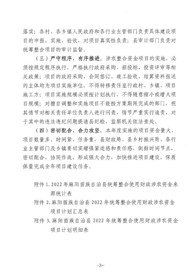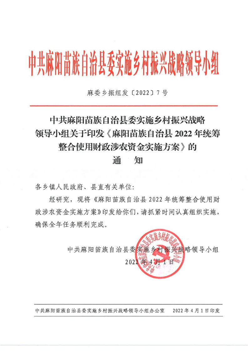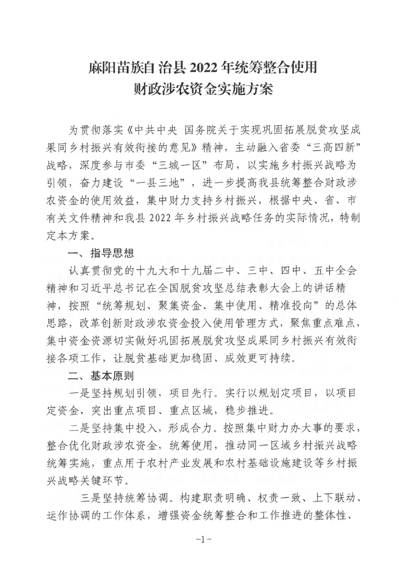麻陽苗族自治縣2022年統籌整合使用財政涉農資金實施方案 麻陽苗族自治縣人民政府 https://www.zwgsc.com 發布時間: 2022-04-07 08:41 【字體:大 小】 2022年涉農整合資金實施方案附表 分享到 來源:麻陽縣財政局 作者: