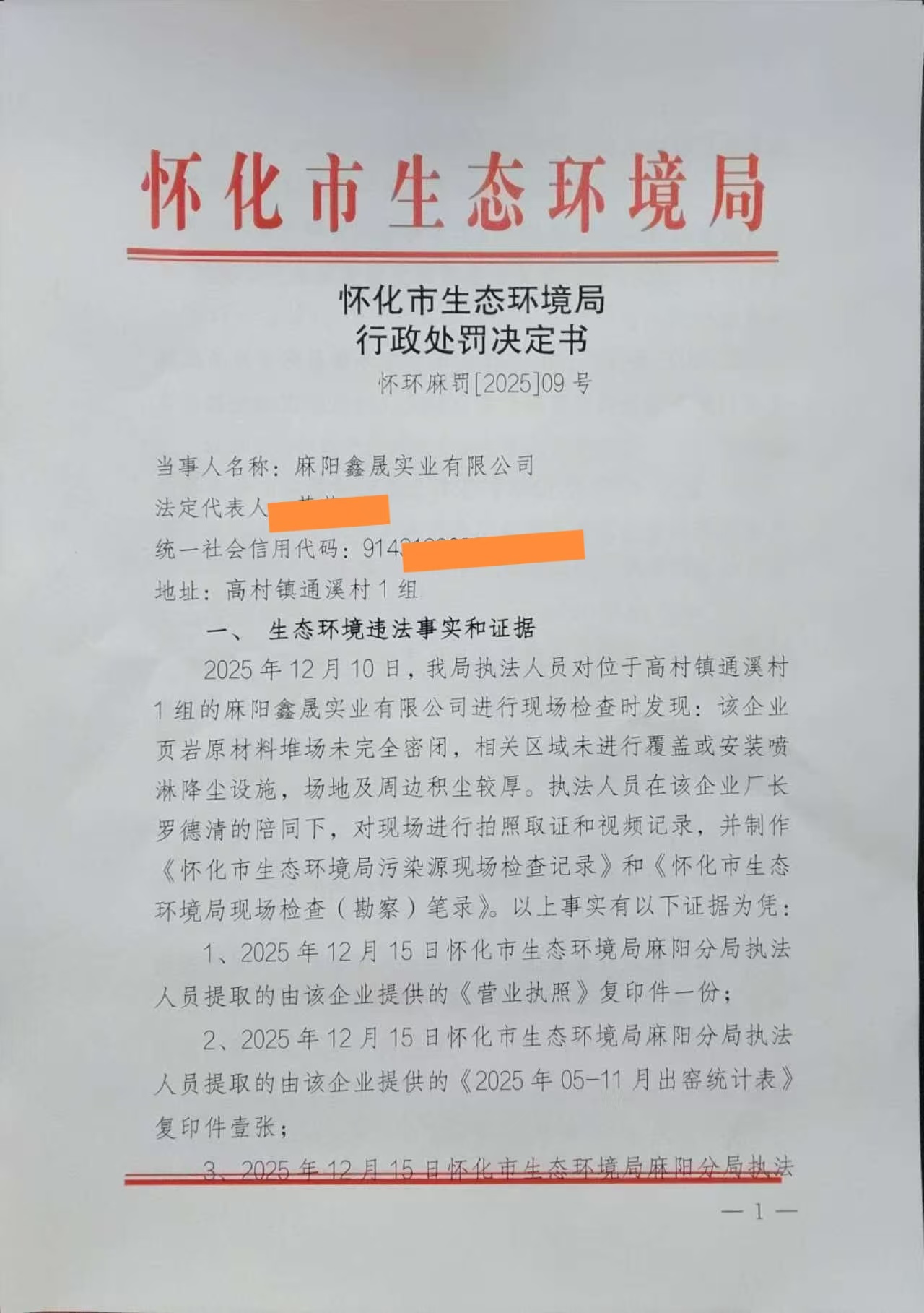 懷化市生態環境局行政處罰決定書 懷環麻罰〔2025〕09號 麻陽苗族自治縣人民政府 https://www.zwgsc.com 發布時間: 2025-12-26 15:07 【字體:大 小】 分享到 來源:市生態環境局麻陽分局 作者:
