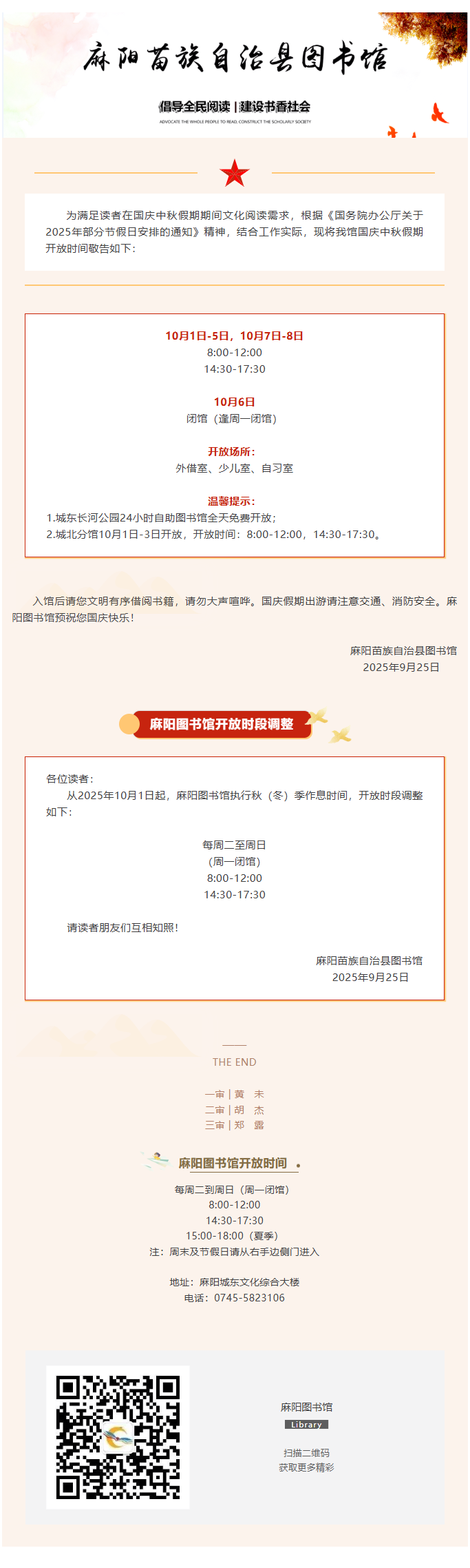 麻陽圖書館國慶中秋假期期間開放安排(附開放時段調整公告) 麻陽苗族自治縣人民政府 https://www.zwgsc.com 發布時間: 2025-09-25 16:03 【字體:大 小】 分享到 來源:麻陽圖書館 作者: