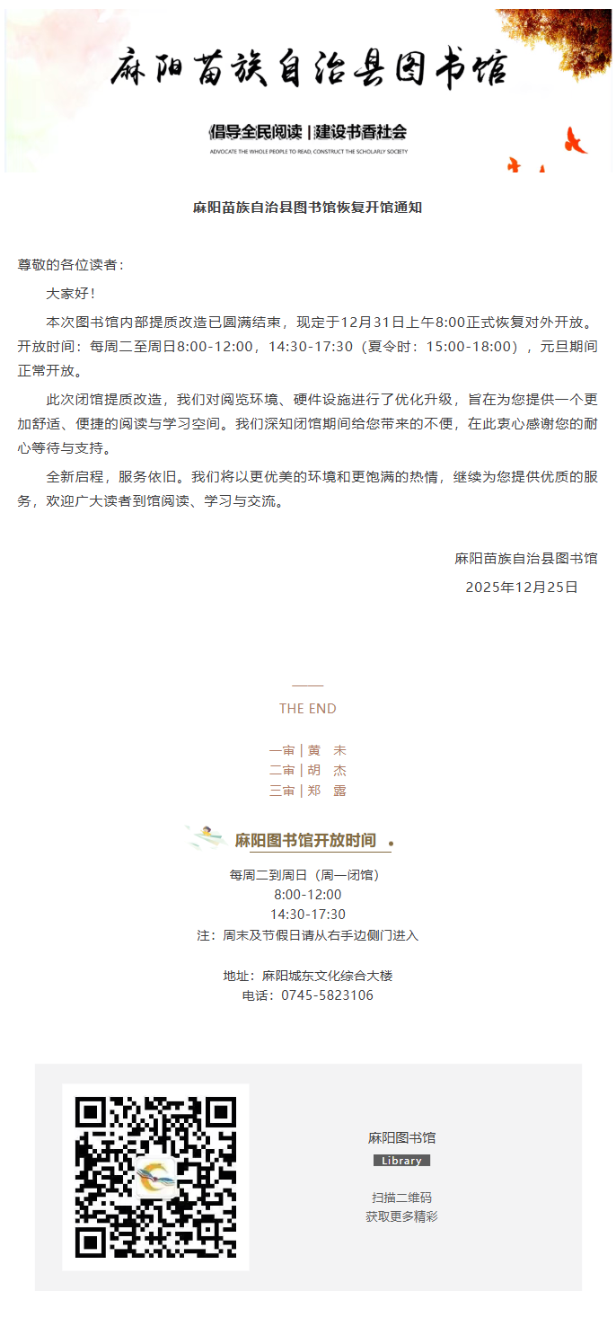 麻陽苗族自治縣圖書館恢複開館通知
