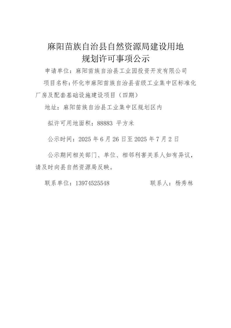 建設用地規劃許可事項公示(省級工業集中區標準化廠房及配套基礎設施建設項目(四期)) 麻陽苗族自治縣人民政府 https://www.zwgsc.com 發布時間: 2025-06-26 08:32 【字體:大 小】 分享到 來源:麻陽縣自然資源局 作者: