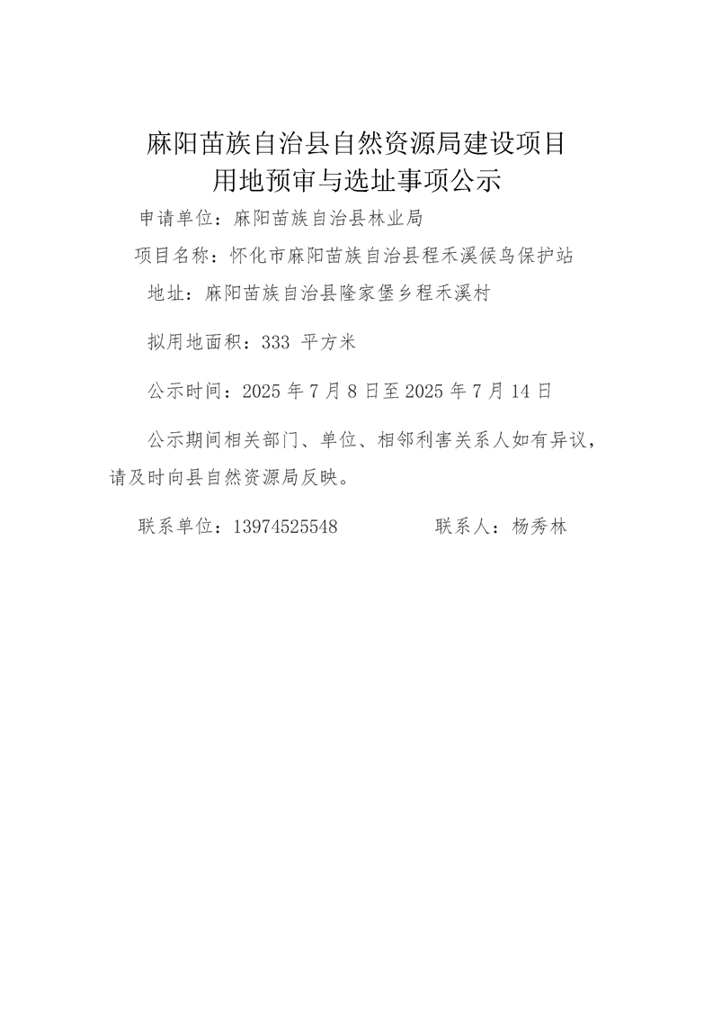 建設項目用地預審與選址事項公示(程禾溪候鳥保護站) 麻陽苗族自治縣人民政府 https://www.zwgsc.com 發布時間: 2025-07-08 08:35 【字體:大 小】 分享到 來源:麻陽縣自然資源局 作者: