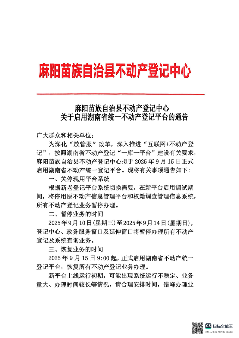 關於啟用湖南省統一不動產平台的公告
