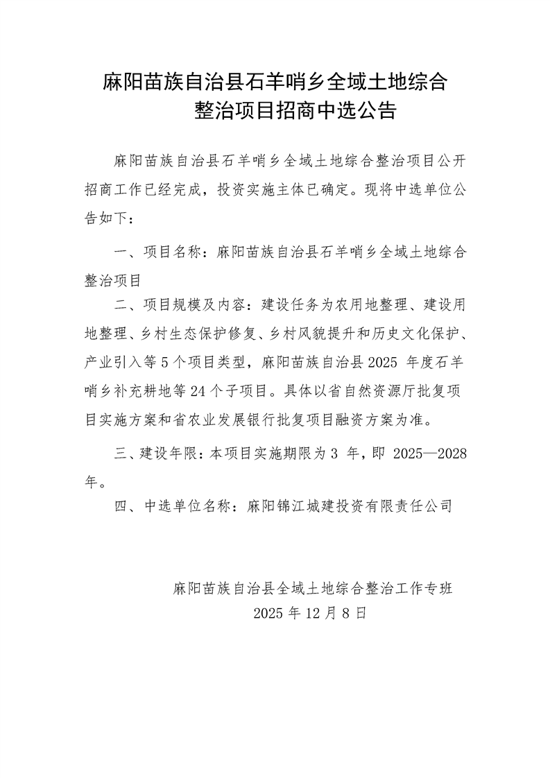 麻陽苗族自治縣石羊哨鄉全域土地綜合整治項目招商中選公告
