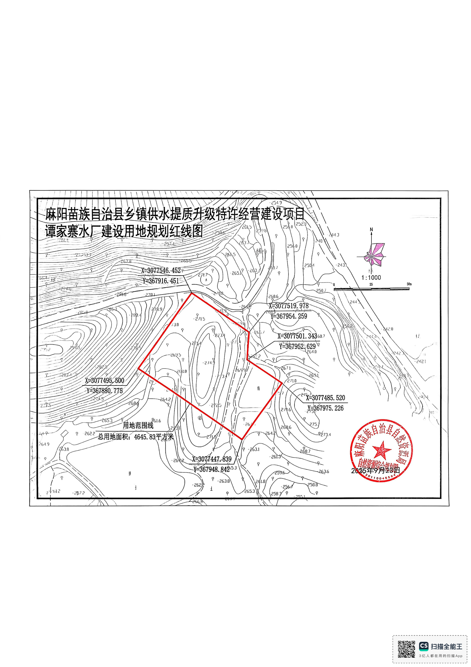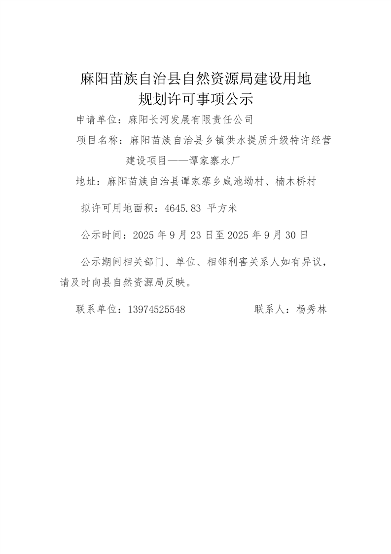 建設用地規劃許可事項公示(譚家寨水廠) 麻陽苗族自治縣人民政府 https://www.zwgsc.com 發布時間: 2025-09-23 10:51 【字體:大 小】 分享到 來源:麻陽縣自然資源局 作者: