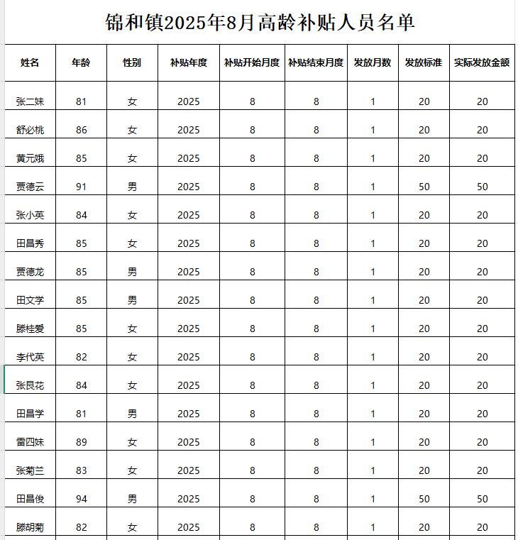 附件:【養老服務】錦和鎮2025年8月高齡補貼人員名單