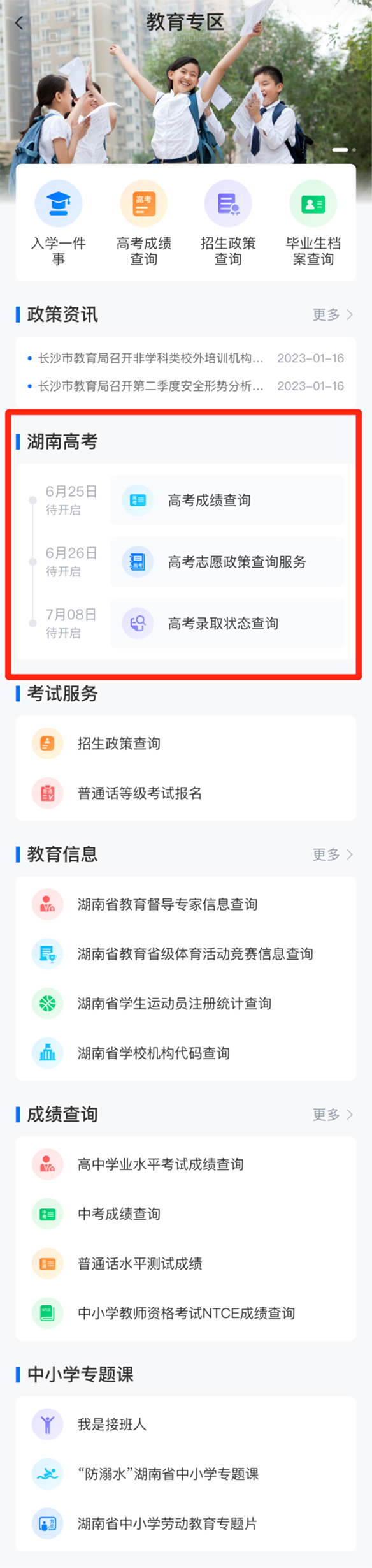 如何查詢成績?考生可通過“湘易辦”超級服務端“智慧教育”專區服務查詢2023年湖南高考成績、高考誌願政策及高考錄取狀態。