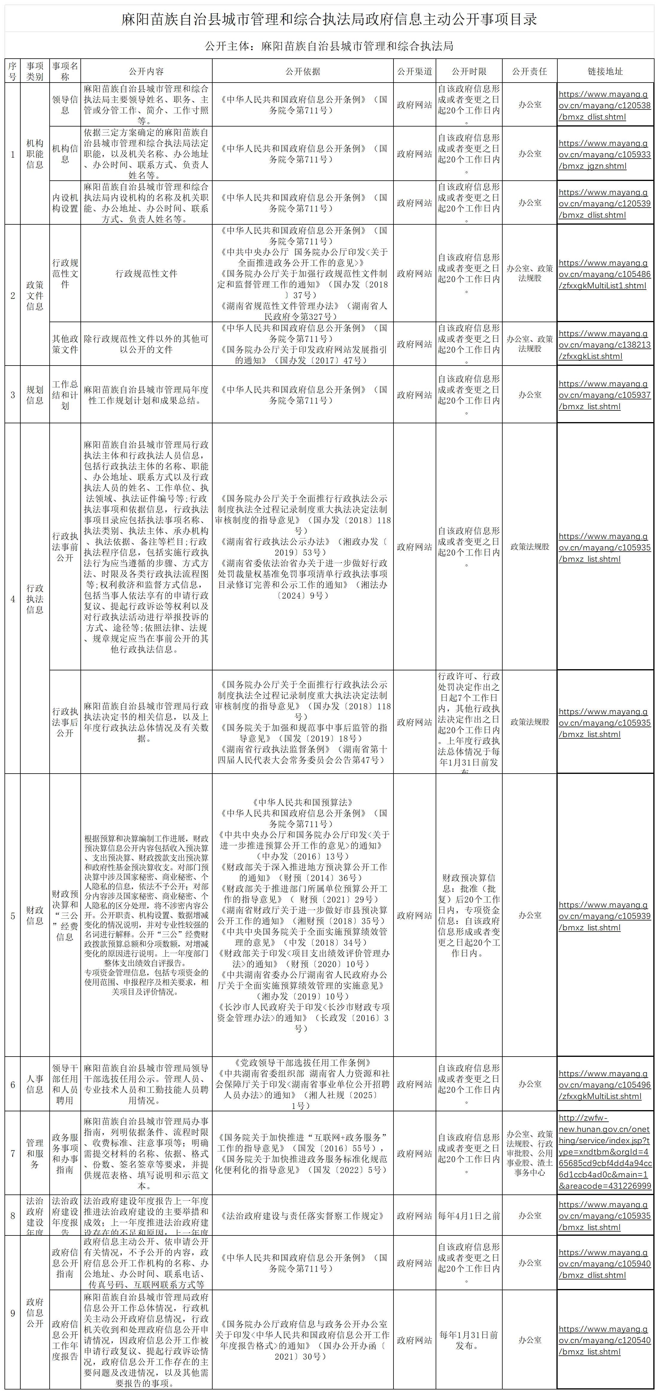 麻陽苗族自治縣城市管理和綜合執法局政府信息主動公開事項目錄