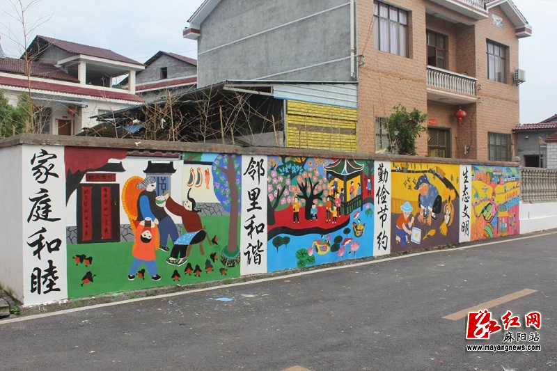 5月初,在四、五組院落夜會上確定清廉家訓內容後,經隆家堡鄉婦聯、團委邀請,5月中旬麻陽職中在步雲坪村四、五組以“家庭和睦、鄰裏和諧、勤儉節約、生態文明”清廉家訓為題,創作了一幅長約15米的主題繪畫。8月中旬,湖南文理學院大學生暑期社會實踐團隊圍繞清廉家訓,創作了“以清為美、以廉為榮”的主題牆繪。